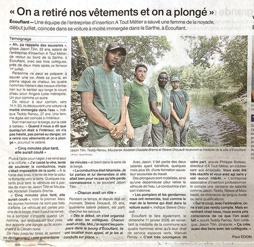 Nous sommes très fiers de nos 4 salariés Espaces Verts d’ A Tout Métier Teddy RENOU, Jason TILIN, Steeve DROUAULT et Moubarak ABDALLAH qui n’ont pas hésité le 1er juillet dernier à se jeter à l’eau dans la Sarthe pour sauver une femme de la noyade.